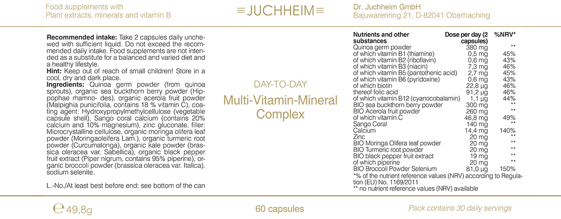 In order to supply the body with vitamins, minerals, trace elements and plant substances during the change in diet, 7 additional food supplements are recommended. The ingredients of these dietary supplements can be found in the respective products in the shop.